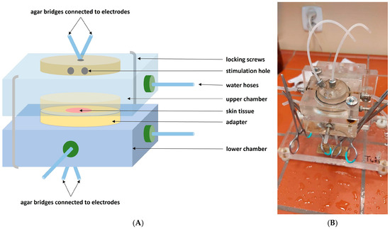 Each specimen was exposed to 1 mL of a solution of one pyrethroid. After incubation, the specimens were mounted in the modified Ussing chamber to measure the electrophysiological parameters (Figure 2). The connection of the chamber with the preamplifier, amplifier, and measuring equipment was provided by pairs of Ag/AgCl electrodes and agar bridges. The modification of the chamber included the arrangement of a tissue sample in a horizontal position, with the stratum corneum upward and toward a stimulation nozzle (the scheme presented in Figure 3). For the duration of a stimulation, a nozzle connected to a peristaltic pump was attached to the chamber, from which a fluid flowed out of the peristaltic pump at a volume of 0.06 mL/s (1 mL/15 s) and a temperature of 25 °C from a distance of 3–5 mm from the tissue surface, imitating drops falling on the tested skin’s surface. Mechanical–chemical stimulations with Perm or Delta and mechanical stimulations with RS were performed. The chambers were filled with Perm or Delta solutions, respectively. The area of the examined tissue samples was 0.25 cm2. The measurement of the electrophysiological parameters lasted 15 min.