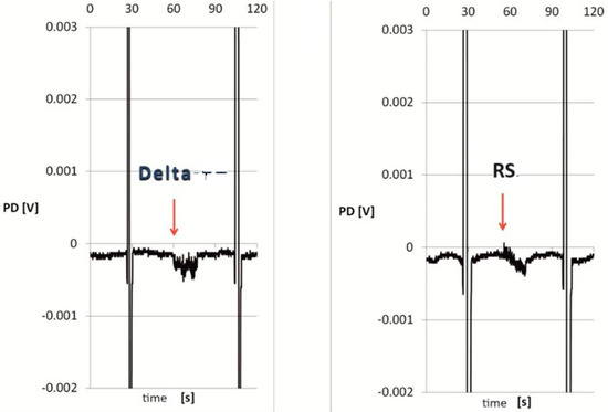 Exemplary diagram of changes in the transepithelial electrical potential during a 15-s mechanical–chemical (Delta) and a mechanical (RS) stimulation for a single skin fragment exposed to the deltamethrin solution for 30 min. Abbreviations: RS—iso-osmotic Ringer’s solution, Delta—deltamethrin solution (0.01 mM) in RS, PD—transepithelial electric potential measured in stationary conditions, ↓—start of the 15-s stimulation, and vertical lines—resistance.