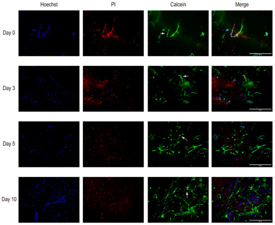 Fluorescence viability during culture of 10 days. Immunofluorescence micrographs of encapsulated tSVF in skin ECM hydrogel cultured for 0, 3, 5, and 10 days. Hoechst staining (blue) as counterstaining for DNA identifies nucleated cells. Propidium iodide staining (red) identifies dead cells. Calcein AM (green) stains viable cells. The arrows show examples of cells with a spindle-shaped appearance, reminiscent of mesenchymal cells. Original magnification: 10×, scale bar: 400 µm.