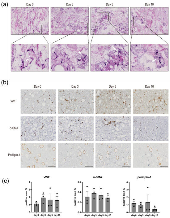 HE staining and quantitative immunohistological results. Hematoxylin–eosin-stained (a) and immunohistochemically stained (vWF—vasculature, αSMA—myofibroblasts, perilipin-1—adipocytes). (b) Micrographs and the quantification of ECM-encapsulated tSVF, cultured for 0, 3, 5, and 10 days. Calculated statistical data (c). Insets and arrows depict ‘islands’ of tSVF inside the skin-derived ECM hydrogels. Densitometry was used to determine the percentage of stained area (positive area). Nonparametric data were analyzed with the Kruskal–Wallis test for comparisons among three groups, followed with Dunnett’s post hoc test. Mean values are represented by bars and SEM values are represented by the scales. The data are from 3 independent experiments. Five random ROIs were measured for every single sample. Each dot represents the mean of three parallel samples from a single patient. Original magnification—40×, scale bar—200 µm.