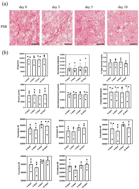 Collagen organization and alignment. Histochemical staining with picrosirius red (a) to visualize collagen fibers and ECM architecture of ECM hydrogel-encapsulated tSVF cultured for 0, 3, 5, and 10 days (scale bars—200 µm). Fiji plugin TWOBLI was used to assess 11 parameters (b) that represent surrogate descriptors of collagen matrix. Mean values are represented by bars and SEM values are represented by scales. These 11 parameters are surrogate markers for architecture and encompass fiber numbers (endpoints and normalized endpoints), apparent branching of fibers (branch points and normalized branching), shape of fibers (curvatures ’20, 30,40, 50, 60, which are arbitrary representations of the curves in fibers), and two parameters that depict the density of the collagen matrix (resp. high density matrix and fractal dimensions). None of these parameters changed over the course of ten days culture.