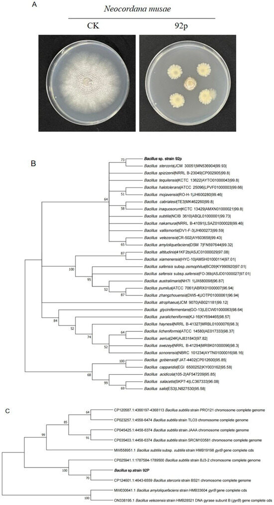 (A) Antagonistic activity of Strain 92p against N. musae. The phylogenetic tree of Bacillus sp. Strain 92p was constructed using the maximum-likelihood method for the analysis of two genes: the 16S rRNA gene (B) and the gyrB gene sequence (C).