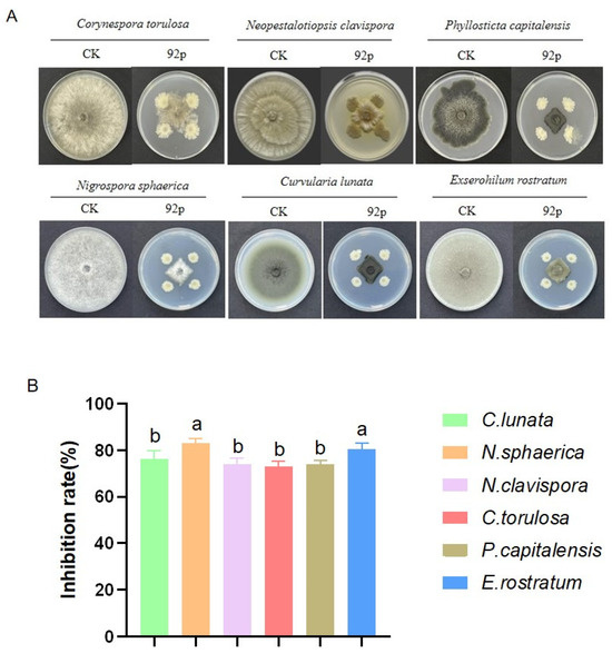 The 92p strain demonstrated potent antifungal activity against multiple phytopathogens during in vitro experiments. The inhibitory effect of the 92p strain on Cur. lunata, P. capitalensis, Cor. torulosa, Nigr. sphaerica, Neo. clavispora, and E. rostratum exceeded 70%. The most pronounced antagonistic effects were observed against Nigr. sphaerica, the causal agent of spot disease in bananas, with an inhibition rate of 83.23 ± 1.77%, followed by E. rostratum (80.55 ± 2.36%) and Cur. lunata (76.71 ± 7.09%) (Figure 2A,B).