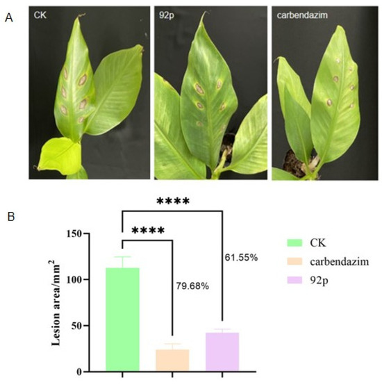 Biocontrol efficacy evaluation of Strain 92p against N. musae was performed through pot experiments. On the fourteenth day after infection, typical disease symptoms began to appear in the banana leaves. Plants treated with Strain 92p or carbendazim exhibited less severe disease symptoms compared to control plants. The lesion area of disease spots in untreated leaves was 112.70 ± 11.95 mm2, while the plants treated with Strain 92p and carbendazim were 43.33 ± 6.81 mm2 and 22.90 ± 6.23 mm2, and the biocontrol efficacy reached 61.55% and 79.68%, respectively. These results indicate that Strain 92p had biocontrol potential against banana CLS (Figure 4).