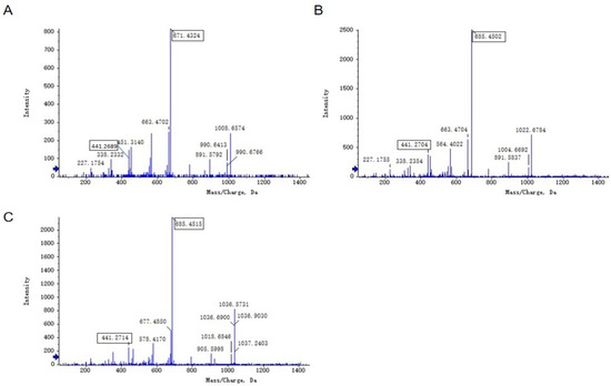 MS/MS spectra of surfactin ions. (A): m/z 1008.6574, (B): m/z 1022.6784, (C): m/z 1036.5731.