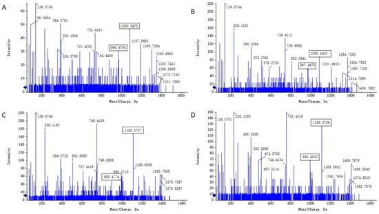 The MS/MS analysis of four fengycins (A–D). (A) m/z 1463.8242, (B) m/z 1477.8224, (C): m/z 1491.8338, (D) m/z 1505.8638. The black box labeled fingerprint product ions 1080 and 966 indicated that the m/z values 1463.8242 and 1477.8224 correspond to fengycin A. The black box labeled fingerprint product ions 1108 and 994 indicated that the m/z values 1491.8338 and 1505.8638 correspond to fengycin B.