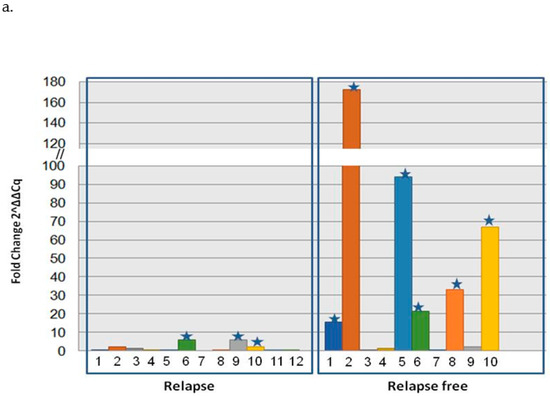 We quantified the mRNA expression of NALCN in a training group of 22 pairs from NSCLC tissues and the adjacent non-cancerous tissues by real-time RT-PCR. NALCN was expressed in all tissues, and its expression was normalized with respect to B2M gene expression using the relative quantification approach described by Livak and Schmittgen [25]. We found that the mRNA level of NALCN was underexpressed in 12 of 22 (54.5%), NSCLC tissues as the expression of NALCN was reduced in tumor samples comparedto the corresponding adjacent tissue. More specifically, the relative expression of NALCN (expressed as 2−ΔΔCt) was significantly higher (p = 0.009) in the tissues of 10 NSCLC patients who were relapse-free (mean = 40.7 ± 23.2) than in the 12 patients who had relapsed during the follow-up period (mean = 6.8 ± 1.8) (Figure 3a). In addition, NALCN was underexpressed in the vast majority of patients who had relapsed (9/12 (75%)), while only 3 out of 10 patients had not relapsed underexpressed NALCN.