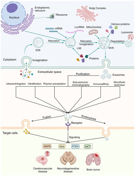 Exosomes, which originate from endocytosis, are secreted by nearly all cell types and are present in various extracellular fluids [2,3,4,5,6]. Initially identified in sheep reticulocytes by Johnstone et al. over three decades ago and regarded merely as cellular debris, the perception of exosomes has dramatically evolved [7]. It is now recognized that exosomes facilitate intercellular communication, influencing a wide array of biological processes, including angiogenesis, inflammation, apoptosis, and the modulation of the cellular microenvironment [5,8,9]. Notably, exosomes can traverse the BBB under certain conditions, underscoring their potential to affect CNS pathophysiological processes and serve as viable drug carriers for treating CNS disorders [10,11]. This review provides a comprehensive analysis of the biological characteristics of exosomes and summarizes the current research dedicated to their application, with a particular focus on the relationship between exosomes and CNS disorders.