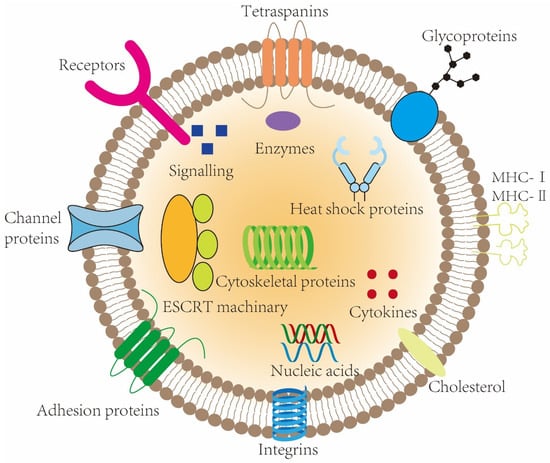 The composition of exosomes reflects the dynamic state of their originating cells, embodying a complex array of proteins, lipids, and nucleic acids (Figure 2) [25,26]. This compositional variability endows exosomes with a broad spectrum of biological functionalities [8]. Proteins within exosomes, whether ubiquitous or cell-specific, are derived from processes such as endocytosis, membrane fusion, and cytoplasmic activities [27,28,29]. Ubiquitous proteins, including cytoskeletal proteins, tetraspanin, and GTPases, are essential for the structural integrity and functional efficacy of virtually all exosomes [15,30,31]. Conversely, cell-specific proteins, dictated by the exosome’s cellular origin, confer unique functional attributes tailored to specific physiological or pathological contexts [15,32,33].