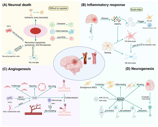 Neurogenesis can occur after various central nerve injuries, being especially important for the improvement of neural function after stroke [82]. Emerging studies manifest that exosomes partly mediate the rehabilitation of infarct focus. Exosomes first promote angiogenesis and lay a solid material foundation for subsequent neurogenesis. Later, exosomes promote neural stem cell recruitment and neuronal differentiation. Processes such as axonal regeneration, remyelination, and synapse formation are subsequently launched, eventually resulting in neurogenesis and even brain structural remodeling [83,84,85]. During neurogenesis, exosomes carry BDNF to promote neuroplasticity [86]. Exosomes regulate neurogenesis mainly by miRNAs. MiR-124-3p is identified with the highest enrichment in neuron-derived exosomes involved in neurogenesis [87]. Further research shows that miR-124-3p may act on the phosphoinositide 3-kinase (PI3K)/AKT/NF-κB signaling pathway. Increased levels of exosomal miR-193a are detected after neuronal differentiation [88], further implying the relationship between exosomal miRNAs and neurogenesis.