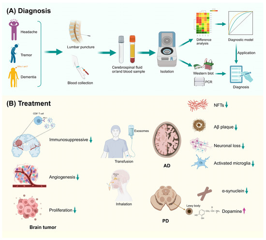 Exosomal application in the diagnosis and treatment of brain tumors, AD, and PD. (A) Exosomes are present in various extracellular fluids, making them accessible from blood and cerebrospinal fluid samples. After purification, their physical and chemical properties are analyzed to diagnose diseases. (B) Exosomes, secreted by almost all cells, can cross the blood-brain barrier. Consequently, they are widely used in the treatment of brain tumors, AD, and PD. Abbreviations: AD, Alzheimer’s disease; PD, Parkinson’s disease; Aβ, amyloid β-protein.