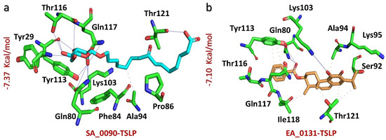 Bonding network analysis of SA_0090–TSLP and EA_0131-TSLP complexes. (a) shows the stick representation of the bonding network of the SA_0090-TSLP complex. (b) shows the stick representation of the bonding network of the EA_0131-TSLP complex.