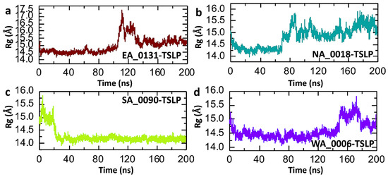 The radius of gyration (Rg) is a measure of the compactness of a protein or protein–ligand complex during molecular dynamics (MD) simulations. It reflects the distribution of the atoms around the center of mass of the system and is an important parameter to assess the structural stability and folding behavior of the complex [50,51]. A stable Rg over time suggests a compact and stable structure, while significant fluctuations can indicate conformational changes, expansion, or potential unfolding of the protein or complex [52]. Consequently, to check the compactness of the shortlisted compound-TSLP complexes, we calculated the Rg with respect to time. In the case of the EA_0131-TSLP complex in the initial 80 ns, the Rg value remains relatively stable at around 14.0–14.5 Å, indicating a compact and stable structure during this period. However, at approximately 100 ns, there is a noticeable increase in Rg to around 17.0 Å, suggesting that the complex undergoes a conformational expansion or loosening. After this peak, the Rg decreases but remains above 14.5 Å, showing moderate fluctuations for the remainder of the simulation. This indicates that the complex does not fully revert to its initial compact structure, suggesting partial structural rearrangements that stabilize at a new level (Figure 4a). Furthermore, in the case of the NA_0018-TSLP complex, a similar pattern of Rg was observed as found in the RMSD plot. Initially, the plot shows a stable Rg value until 65 ns, and then a gradual increase in Rg was recorded, starting from around 14.0 Å and reaching nearly 15.5 Å towards the end. The consistent increase indicates a gradual expansion of the complex, which may reflect a lack of compactness and stability. The fluctuations in the Rg values towards the end of the simulation suggest some dynamic structural rearrangements that prevent the complex from achieving a compact form (Figure 4b). Moreover, the Rg for the SA_0090-TSLP complex quickly stabilizes at around 14.0 Å after an initial adjustment, and it remains consistent with no fluctuations throughout the 200 ns simulation. This stable Rg value suggests that the SA_0090-TSLP complex maintains a compact and stable structure without significant conformational changes. The SA_0090-TSLP complex is highly stable, showing minimal fluctuations in Rg, indicating that the complex remains tightly packed and structurally sound over the course of the simulation (Figure 4c). Furthermore, the Rg of the WA_0006-TSLP complex is initially stable at around 14.5 Å and remains relatively stable with no fluctuations throughout the simulation. There is a small increase in Rg towards the end of the simulation, reaching around 15.0 Å, but the changes are minor and do not indicate significant structural expansion. The WA_0006-TSLP complex demonstrates overall stability with only minor fluctuations, suggesting that the complex is compact and stable for most of the simulation, with a slight tendency towards expansion near the end (Figure 4d). This analysis of the Rg plots complements the previous RMSD analysis, confirming that SA_0090-TSLP and WA_0006-TSLP are the most stable complexes, while NA_0018-TSLP is likely unstable and may not form a strong, compact interaction with the TSLP protein.
