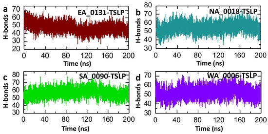 The hydrogen bond (H-bond) analysis provides information on the stability and interactions within a protein–ligand complex over the course of a molecular dynamics (MD) simulation [55]. H-bonds play a crucial role in maintaining the structural integrity and stability of protein–ligand complexes, and a higher number of stable H-bonds generally suggests a more robust and tightly bound complex [56]. Consequently, to check the binding stability of our shortlisted compounds with the TSLP target, we calculated the post-simulation average hydrogen bonds for each complex. The H-bond count for EA_0131-TSLP starts relatively high, around 60–70, indicating strong initial interactions within the complex. Over time, the number of H-bonds gradually decreases, stabilizing between 40 and 50 H-bonds after about 50 ns and maintaining this range throughout the remainder of the simulation (Figure 6a). The decrease in H-bonds over time suggests that EA_0131-TSLP may undergo some structural adjustments, potentially impacting its stability. This aligns with the observations from the RMSD and Rg analyses, which indicated moderate flexibility and expansion in certain regions. However, NA_0018-TSLP, SA_0090-TSLP, and WA_0006-TSLP showed a relatively similar pattern with an average number of hydrogen bonds of 54, 56, and 53, respectively (Figure 6b–d). This analysis revealed the strong binding of the shortlisted compounds with TSLP and also further verify the RMSD and Rg results.