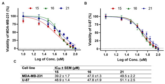 Summary of determination of half-maximal inhibitory concentrations (IC50) for compounds 15, 16, and 21. Dose–response curves (averages ± SEMs, n = 3) for MDA-MB-231 (A) and U-87 (B) cell lines treated with compounds 15, 16, and 21. (C) IC50 value of compounds in tested cells.