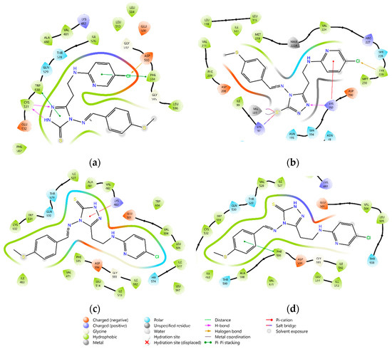 The 2D interaction of compound 21 with amino acid residues in the active sites of corresponding proteins: (a)—21 with BRAF (PDB: 1UWH); (b)—21 with MEK (4U7Z); (c)—21 with BRAF (PDB: 5VAM); and (d)—21 with BRAF (PDB: 4G9C).
