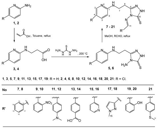 The target hydrazones 7–21 containing a pyridine ring were synthesized as shown in Scheme 1. The reaction of 2-aminopyridine 1 and 2 with acrylic acid in toluene under the reflux conditions gave the corresponding β-alanines 3 and 4 [26]. Compounds 3 and 4 were melted at 200 °C with thioacetohydrazide to provide corresponding 4-amino-1,2,4-triazole-3-thiones 5 and 6 in 74–76% yield. Target 4-substituted-5-(2-(pyridine-2-ylamino)ethyl)-2,4-dihydro-3H-1,2,4-triazole-3-thiones 7, 9, 11, 13, 15, 17, and 19, and their chloro analogs 8, 10, 12, 14, 16, 18, 20, and 21 were synthesized by the reaction of 5 and 6 with corresponding aldehydes in methanol in the presence of a catalytic amount of hydrochloric acid under reflux conditions in a 53–85% yield.