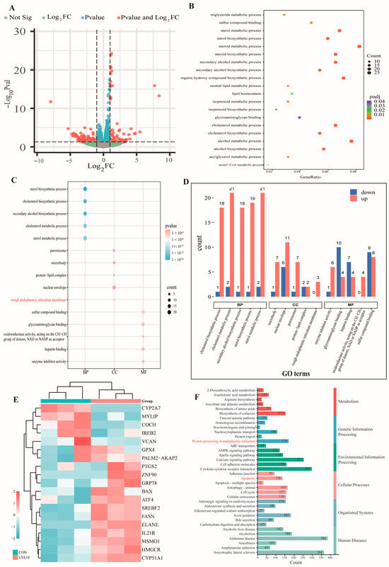 Transcriptomics reveals links between ER stress, steroid synthesis, and apoptosis in the LTA-induced MAC-T. (A) Volcano plot for the comparison between the CON group and the LTA10 group. (B) Scatter plot of enriched GO pathways statistics. (C) Dot plot for top 5 pathways of GO analysis. (D) Gene Ontology (GO) terms of the genes from the intersecting regions. (E) Heatmap of DEGs. (F) Classified KEGG pathways of the genes from the intersecting regions.