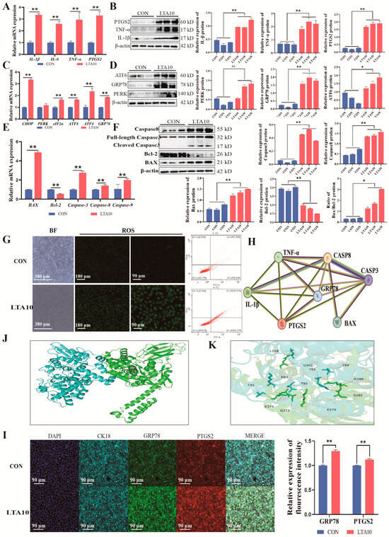 LTA aggravated inflammation, ER stress, and apoptosis in MAC-T. mRNA (A) and protein (B) relative expression of IL-1β, IL-6, TNF-α, PTGS2. mRNA (C) and protein (D) relative expression of CHOP, PERK, eIF2α, ATF6, ATF4, GRP78. mRNA (E) and protein (F) relative expression of BAX, Bcl-2, Caspase-3, Caspase-8, Caspase-9. (G) ROS assay and apoptosis assay in CON and LTA10 groups. (H) STRING predicted the relationship among IL1B, TNF, PTGS2, Caspase-3, Caspase-8, BAX, and GRP78. (J,K) HDOCK protein docking software performs PTGS2-GRP78 docking on proteins. (I) IF stain of CK18, PTGS2, GRP78. (* p < 0.05, ** p < 0.01, ns, not significant) (n = 3). Original images of (B,D,F) can be found in Supplementary Materials.