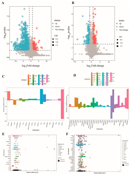 Untargeted lipidomics reveal that LTA enhances ER stress and disrupts lipid balance. (A) Volcano plot for all lipids in positive ionic mode. (B) Volcano plot for all lipids in negative ionic mode. (C) Bar-plot for differential lipids in positive mode. (D) Bar-plot for differential lipids in negative mode. (E) Bubble plot for differential lipids in positive mode. (F) Bubble plot for differential lipids in negative mode.