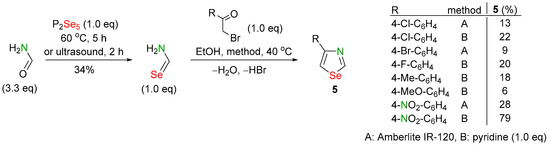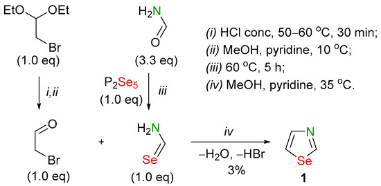 Parent 1,3-selenazole 1 was obtained in a 3% yield by the cyclization of selenoformamide with α-bromoacetaldehyde (Scheme 1) [45,46]. Selenoformamide was prepared from freshly prepared P2Se5 and formamide and used in crude form [47].