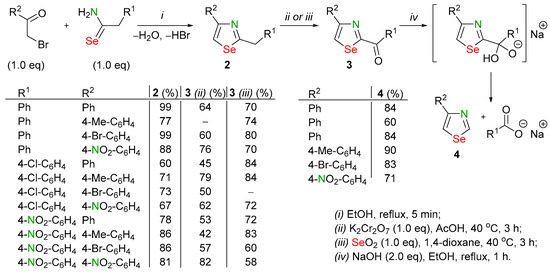 An effective method of the synthesis of 2-unsubstituted 1,3-selenazoles based on 2-benzoyl-1,3-selenazoles was developed (Scheme 2) [48,49]. The cyclization of α-bromoketones with selenoamides, prepared from arylacetonitriles and P2Se5 [47], afforded 2-aryl-1,3-selenazoles 2, containing the benzyl-, p-chlorobenzyl-, and p-nitrobenzyl groups, in 60–99% yields. The oxidation of products with K2Cr2O7 or with SeO2 in 1,4-dioxane yielded 2-benzoyl-1,3-selenazoles 3 in 45–82% and 70–84% yields, respectively. The treatment of 2-benzoyl-1,3-selenazoles 3 with NaOH in ethanol afforded the desired selenazoles 4 in 60–90% yields [48,49].