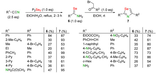 Various 1,3-selenazoles 7 were obtained on the basis of nitriles and freshly prepared P2Se5. The reaction of nitriles with P2Se5 in a refluxing EtOH/H2O mixture afforded a chemoselective and convenient synthesis of a variety of selenoamides 6, (18–84% yields) including a number of new functionalized derivatives. Selenoamides are useful building blocks for the synthesis of 1,3-selenazoles and other pharmacologically significant heterocycles containing nitrogen and selenium. The resulting selenoamides 6 were converted into 1,3-selenazoles 7 in 53–99% yields by the reaction with α-bromoketones in ethanol solution at room temperature (Scheme 4) [47].
