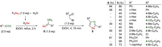 The reaction of benzonitrile, cyclohexanecarbonitrile, 2-tolylnitrile, acetonitrile, diphenylacetonitrile, and 1-naphthonitrile with P2Se5 afforded the selenoamides 8 in 26–84% yields. At the same time, the slow adding of water to the reaction mixture resulted in the formation of small amounts of H2Se, which subsequently added to the nitriles. The cyclization of selenoamides 8 with phenacyl bromides afforded the functionalized 1,3-selenazoles 9 in 34–98% yield. The yields of the products are generally higher for the aromatic substrates compared to aliphatic compounds (Scheme 5) [50].
