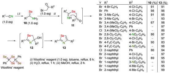 2,4-Diaryl-1,3-selenazoles 13 were prepared by the two-component cyclization of the primary selenoamides with α-haloketones (Scheme 6) [51]. Selenoamides 10 were obtained in 86–98% yields by the reaction of Woollins’ reagent with aromatic nitriles in refluxing toluene, followed by hydrolysis with water. A solution of α-haloketone in MeOH was added to a refluxing solution of arylselenocarboamide in MeOH and the reaction mixture was then refluxed for 1 h. A series of 2,4-diaryl-1,3-selenazoles 13 was prepared in 86–99% yields based on this approach. The reaction proceeded with the formation of intermediate 11 followed by the intramolecular cyclization and the dehydration process of intermediate 12.