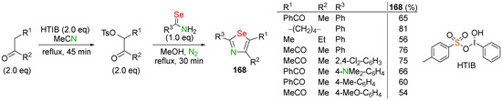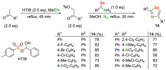 A versatile reagent for organic synthesis, [hydroxy(tosyloxy)iodo]benzene (HTIB), is especially useful in the reaction with ketones. The tosyloxylation of ketones with HTIB, followed by the treatment with primary selenoamides, provides a convenient method of synthesis for 1,3-selenazoles, avoiding the use of toxic and lachrymatory α-haloketones. Thus, 2,4-substituted 1,3-selenazoles 14 were prepared in 58-85% yields from the appropriate ketones and selenoamides under reflux in a solvent mixture MeCN/MeOH (Scheme 7) [52].