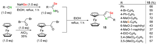 New 2-aryl-4-ferrocenyl-1,3-selenazoles 15 were synthesized in 43–72% yields by the reaction of aryl selenoamides with (2-bromoacetyl)ferrocene in refluxing ethanol. Aryl selenoamides were prepared by the treatment of aromatic nitriles with NaHSe in refluxing ethanol. 2-bromoacetyl ferrocene was prepared in 35% yield by the reaction of ferrocene with bromoacetyl bromide in the presence of AlCl3 (Scheme 8) [53].