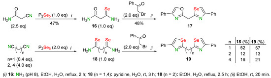 Moreover, the use of P2Se5 allowed researchers to carry out the convenient synthesis of selenocarboxylic diamides, which were converted into bis(selenazol-2-yl)alkanes. The reaction of P2Se5 with malonic dinitrile, 1,2-dicyanoethane, and 1,4-dicyanobutane yielded malonic diselenoamide, succinic diselenoamide, and adipic diselenoamide (18). The double cyclization of compounds (18) with phenacyl bromide in the EtOH/H2O mixture afforded bis-selenazoles 19 (Scheme 9) [50].