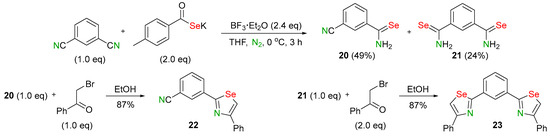 The reaction was carried out under an argon atmosphere at 0 °C in THF in the presence of boron trifluoride ether complex. After workup, the residue was purified by flash chromatography. Prepared 3-cyanobenzenecarboselenoamide 20 and 1,3-benzenedicarboselenoamide 21 were used as substrates for the preparation of 1,3-selenazoles. Selenazole 22 and diselenazole 23 were obtained in 87% yields by the reaction of selenoamides 20 and 21 with phenacyl bromide in EtOH (Scheme 10) [54].