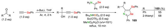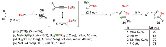 A new cycloaddition reaction of the phenylselanylpropargyl alcohols with selenobenzamide in the presence of catalytic system Sc(OTf)3-MeNO2-H2O-Bu4NHSO4 was developed (Scheme 11) [55]. The use of this effective catalytic system allowed researchers to generate α-selanylpropadienyl cations, which were involved into cycloaddition reactions to form cycloadducts 24. 4-arylmethyl-2-phenyl-1,3-selenazoles 25 were obtained in 54–99% by the treatment of cycloadducts 24 with tributyltin hydride in the presence of azobisisobutyronitrile (AIBN) and methyllithium (Scheme 11) [55].
