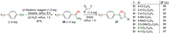 A number of novel 2,4-diaryl-1,3-selenazoles 27 bearing pentafluorosulfanyl SF5 functional groups were obtained by the two-component cyclization of selenoamide with α-haloketones (Scheme 12) [56]. The initial selenoamide 26 was obtained in an 87% yield from the reaction of Woollins’ reagent with 4-pentafluorosulfanylbenzonitrile, followed by hydrolysis. The cyclization of selenoamide 26 with α-haloketones in refluxing ethanol made it possible to obtain a number of 1,3-selenazoles 27 in 89–99% yields (Scheme 12) [56].