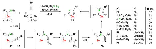 A method for the synthesis of 2,4-substituted 1,3-selenazoles 28 in 20–84% yields by the cyclocondensation of primary selenoamides and alkynyl(phenyl)iodonium salts was developed (Scheme 13) [57]. The synthesis was carried out in the presence of Et3N in MeOH under a nitrogen atmosphere.
