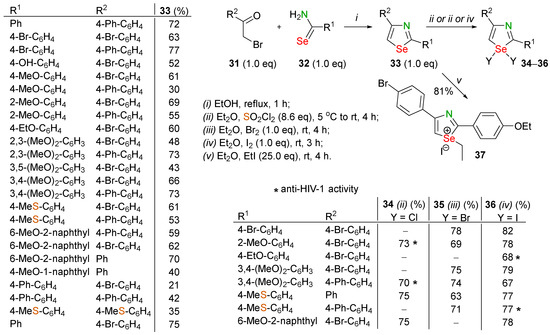 The cyclization of primary arylselenoamides 32 with α-bromoketones 31 in EtOH afforded a variety of 2,4-diaryl-1,3-selenazoles 33 in 21–77% yields (Scheme 14) [58]. The halogenation of the 2,4-diaryl-1,3-selenazoles 33 with SO2Cl2, bromine and iodine in diethyl ether yielded 1,1-dihalo-2,4-diaryl-1,3-selenazoles 34–36 in good yields (63–82%) while the reaction of compound 33 (R1 = 4-EtO-C6H4, R2 = 4-Br-C6H4) with ethyl iodide yielded selenonium salt 37 in an 81% yield (Scheme 14) [58].