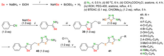 A number of 1,3,4-thiadiazole derivatives containing 1,3-selenazole with fragments of Schiff base were synthesized (Scheme 16) [60]. As a result of the interaction of benzonitrile with NaHSe, selenobenzamide was obtained, and this reacted with 1,3-dichloroacetone in acetone at room temperature to form compound 39. Product 40 was obtained by the reaction of 1,3-selenazole 39 and 2-amino-5-mercapto-1,3,4-thiadiazole using PEG-400 as a catalyst under reflux. Finally, the condensation of compound 40 and substituted aromatic aldehydes in the presence of trimethyl orthoformate using benzyl triethylammonium chloride (BTEAC) as a catalyst made it possible to obtain the target compounds 41 under reflux. As a result of this reaction, a series of 1,3,4-thiadiazole derivatives containing 1,3-selenazole 41 with Schiff base fragments were prepared in 38–72% yields. These derivatives have an increased number of active groups in the molecule (Scheme 16) [60].
