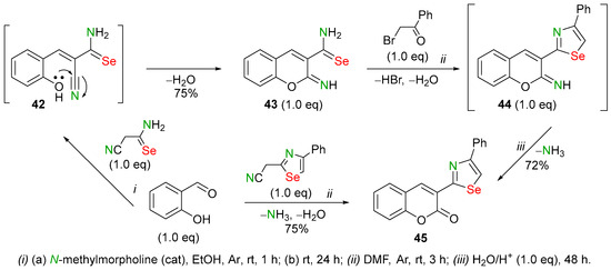 The convenient synthesis of a chromenone derivative, bearing the 1,3-selenazole ring, was developed (Scheme 17) [61]. The condensation of salicylaldehyde with cyanoselenoacetamide under Knoevenagel reaction conditions led to the formation of intermediate 42. Subsequent pyran ring closure proceeded to yield 2-oxo-2H-chromeno-3-carboselen-amide 43 in a 75% yield. The product 43 entered easily into the Hantzsch-type condensation with phenacyl bromide in DMF at room temperature to form 3-selenazolyl-substituted 2-iminocoumarin 44, which was rapidly hydrolyzed under the reaction conditions to form 3-(4-phenyl-1,3-selenazol-2-yl)-2H-chromen-2-one 45 in a 72% yield. Compound 45 was also obtained in a 75% yield by the condensation of salicylaldehyde with (4-phenyl-1,3-selenazol-2-yl)acetonitrile (Scheme 17) [61].