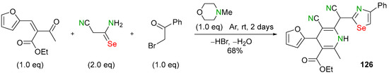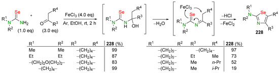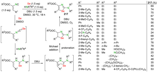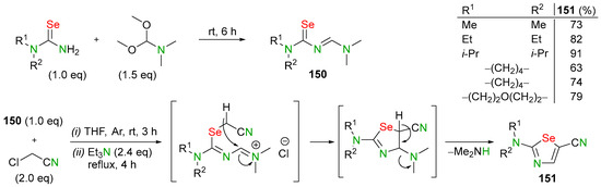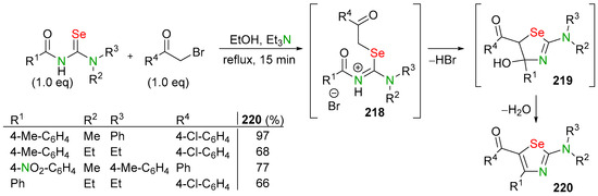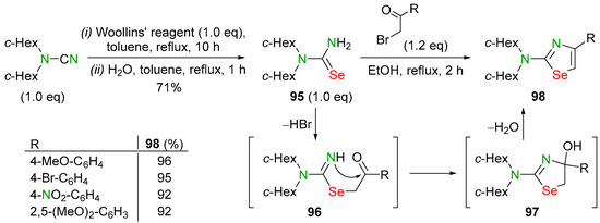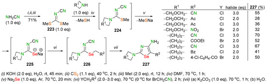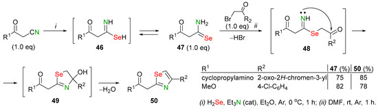 A plausible reaction pathway is proposed [62]. At the initial stage, the hydroselenide ion is generated from H2Se and adds to the cyano group of starting cyanides to yield intermediate 46, which is stabilized as selenoamides 47. The reaction of selenoamides 47 with α-bromoketones leads to selenide 48, which undergoes intramolecular cyclization to substituted dihydroselenazole 49. The latter undergoes dehydration to afford final aromatic 1,3-selenazoles 50 (Scheme 18) [62].