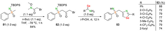 A metal-free method was efficiently developed for the synthesis of sulfoximine tethered selenazoles. N-TBDPS-protected sulfoximine 51 was treated with n-BuLi followed by the addition of 2-bromo-N-methoxy-N-methylacetamide (Scheme 19) [63]. A key compound, α-bromoalkanone 52, was obtained in an 84% yield. The target functionalized selenazoles 53 were synthesized in good yields (72–88%) by the reacting compound 52 and the selenoamides in 2-propanol at an ambient temperature (Scheme 19) [63]. The cyclization and the TBDPS deprotection processes occurred as a one-pot procedure. The developed metal-free approach to 2,4-substituted 1,3-selenazoles 53 can be considered a very useful contribution to the growing field of the synthesis and studies of sulfoximine compounds in medicinal chemistry.