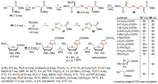 A novel method for the one-pot cascade synthesis of 2,4-disubstituted 1,3-selenazoles was developed (Scheme 20) [64]. Triethylamine, pentafluorophenyl diphenylphosphate (FDP), β-azido diselenide 56, and triphenylphosphine were added to a solution of acid or anhydride in acetonitrile and the reaction mixture was stirred at 70 °C. This approach allowed obtaining selenazolines 57 in 54–77% yields. In turn, selenazolines 57 were oxidized by activated manganese oxide in 1,2-dichloroethane to yield selenazoles 58 in 89–95% yields (Scheme 20) [64]. Azido diselenide 56 was obtained in a 44% yield from commercially accessible N-Boc-L-serine methyl ester (54) in several stages with the formation of the intermediate N-Boc-protected homoselenocystine 55. The valuable application of this method could be seen in the efficient total synthesis of selenazofurin, which showed high antitumor activities (Scheme 20) [64].