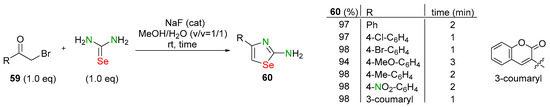 Sodium fluoride was added to the solution of the corresponding phenacylbromide or 3-(2-bromoacetyl)-2H-chromen-2-one 59 and selenourea in MeOH. After stirring the mixture at an ambient temperature for 1-3 min, water was added and analytically pure substituted 1,3-selenazole derivatives 60 were separated in excellent yields as solids (Scheme 21) [65].