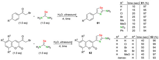 A rapid and efficient procedure for the synthesis of 2,4-disubstituted-1,3-selenazoles 61,62 was developed based on the reaction of α-bromoketones with selenourea at room temperature in aqueous medium under ultrasonic irradiation. Analytically pure products 61,62 were formed in 91–99% yields for 10–60 s. The advantages of this methodology include its operational simplicity, ability to save time, use of mild reaction conditions, and lack of by-products (Scheme 22) [66].