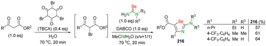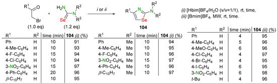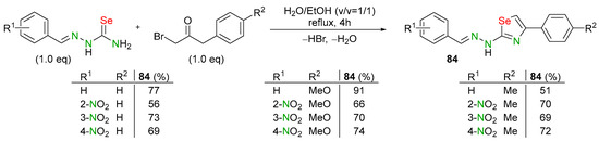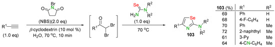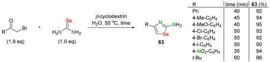 2-amino-4-substituted-1,3-selenazoles 63 were synthesized in 86–95% yields from α-bromoketones and selenourea in the presence of β-cyclodextrin in water at 50 °C under atmospheric pressure. This methodology also avoids an inert atmosphere and high temperatures, making it more convenient to use (Scheme 23) [67].