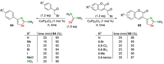 Bromo acetyl benzene or 3-bromo acetyl coumarin derivatives and selenourea in the presence of CuPy2Cl2 reacted very efficiently in a mortar without any solvent. CuPy2Cl2 was added to a mixture of α-bromoketone and selenourea in a mortar and ground with a pestle at an ambient temperature. The reactions were completed within 30 min of milling, and the required products 64,65 were obtained in high yields (87–96%). The reaction under solid-phase conditions was environmentally safe, completed in higher yields, and had a more convenient workup (Scheme 24) [68].