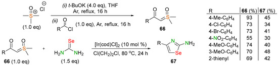 A series of 1,3-selenazoles were synthesized via Ir-catalyzed sulfoxonium ylide insertion chemistry (Scheme 25) [69]. Sulfoxonium ylides 66 were synthesized as precursors to 1,3-selenazoles from trimethylsulfoxonium chloride and acid chloride substrate in THF using t-BuOK in 55–93% yields. Then, a mixture of β-ketosulfoxonium ylide 66 and selenourea in dichloroethane was heated to 80 °C and [Ir(cod)Cl]2 was added to the mixture. The resulting mixture was stirred at 80 °C. After workup, 4-aryl-substituted 2-amino-1,3-selenazoles 67 were isolated in 30–48% yields. This was a useful, substrate-tolerant approach to 1,3-selenazoles that may find application in medicinal chemistry (Scheme 25) [69].