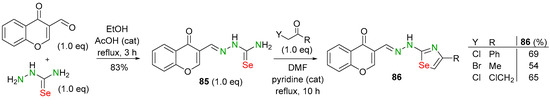 - Ali, T.E.; Assiri, M.A.; Aboelwafa, H.R. Synthesis and cytotoxicity properties of some novel functionalized 2-{2-[(4-oxo-4H-chromen-3-yl)methylene]-hydrazinyl}-1,3-selenazoles. Heterocycles 2021, 102, 920–929. [Google Scholar] [CrossRef]