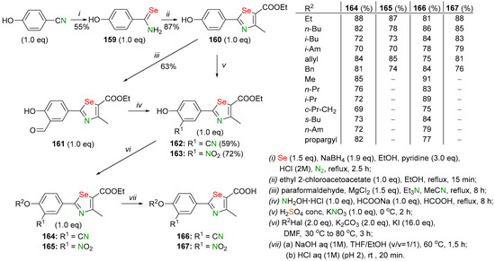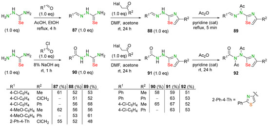 - Koketsu, M.; Imagawa, M.; Mio, T.; Ishihara, H. Preparation of 1,3-selenazoles using selenazadienes. J. Heterocycl. Chem. 2005, 42, 831–834. [Google Scholar] [CrossRef]