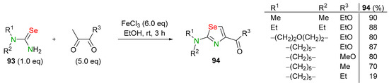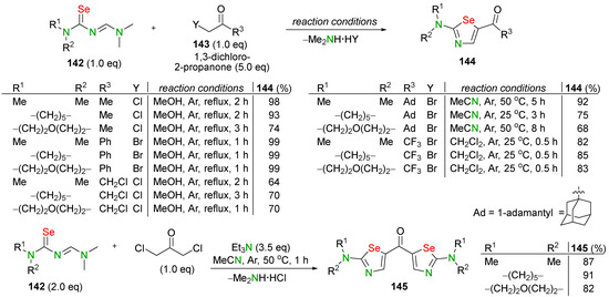- Kanoh, K.; Ishihara, H.; Koketsu, M. Preparation of 2-dialkylamino-1,3-selenazoles by reaction of N,N-unsubstituted selenoureas with α,α-diketones. Heterocycles 2007, 74, 1009–1014. [Google Scholar] [CrossRef]